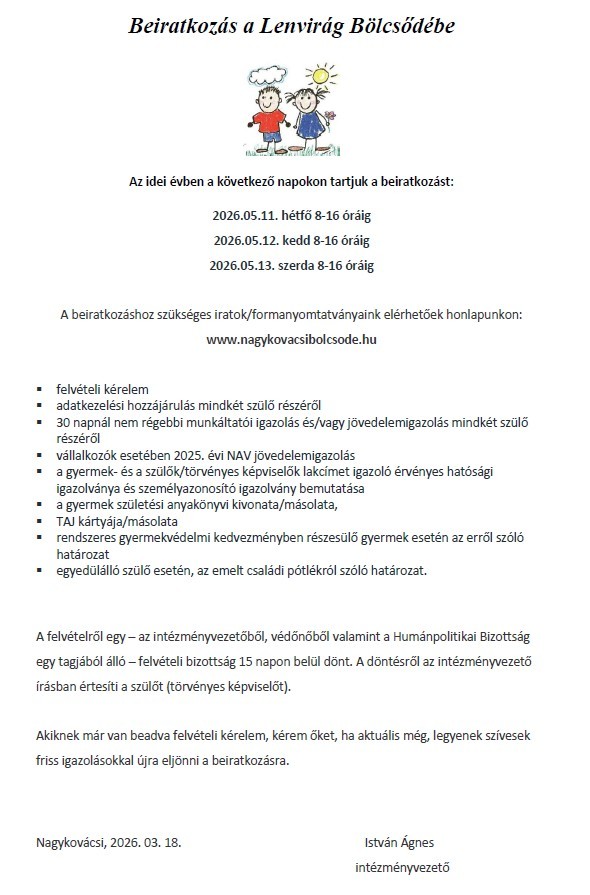 4. Beiratkozás a Lenvirág bölcsődébe 2026
