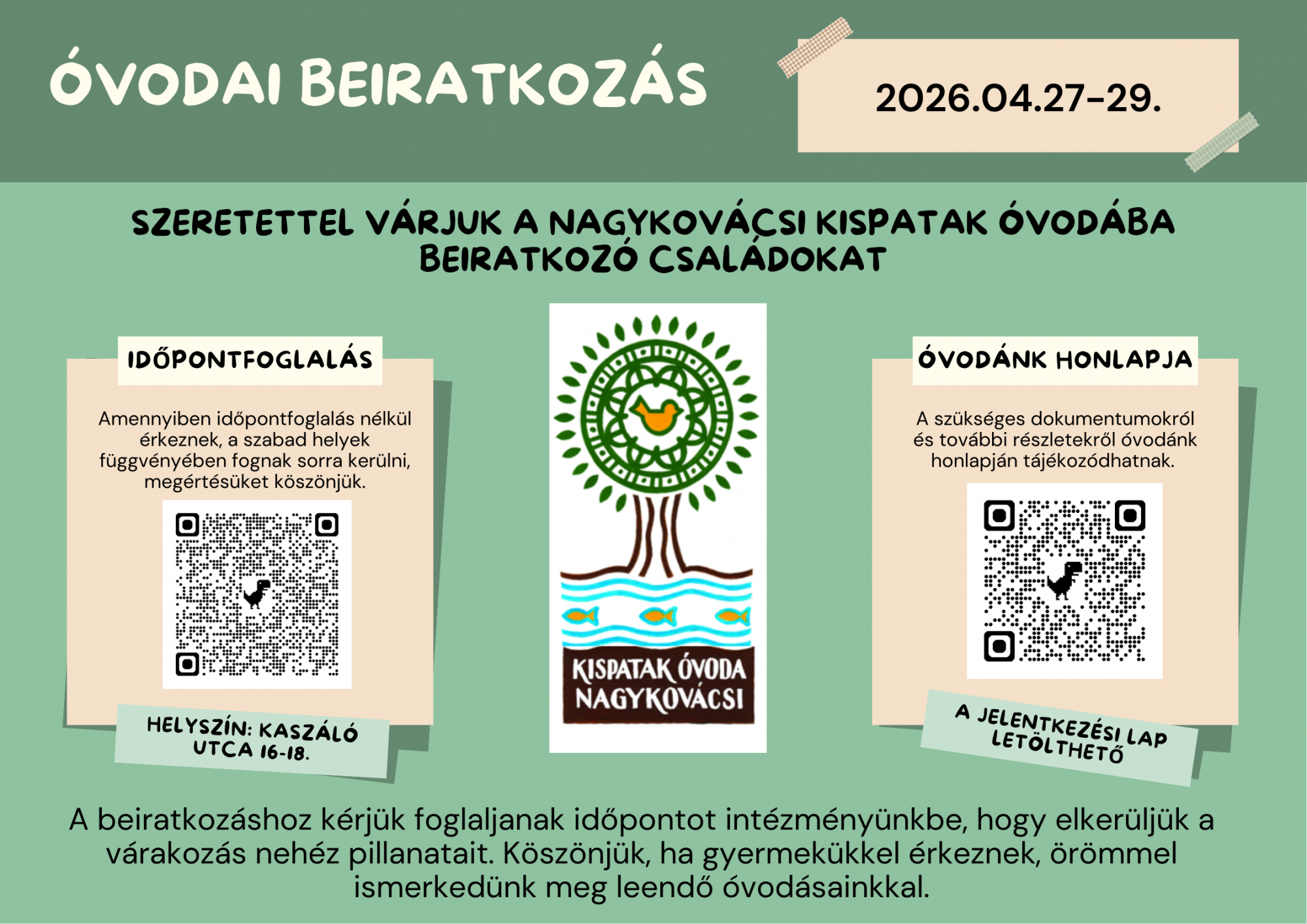 Nagykovácsi Nagyközség Önkormányzatának Képviselő-testülete a 2026. március 26-án megtartott ülésén döntést hozott a Nagykovácsi Kispatak Óvoda 2026/2027. nevelési évre való beiratkozás rendjéről.